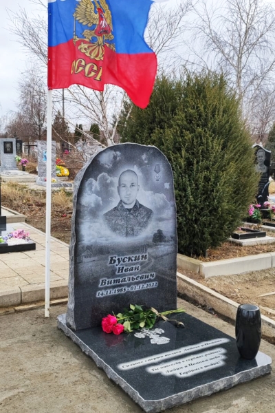 Ростовой памятник для молодого военного памятник выполнен в лаконичном черном цвете, сочетает в себе фигурную гранитную стелу и открытое надгробие. На стелу нанесена цветная печать портрета в полный рост. Формы и размеры памятника подобраны специалистами с учетом нагрузки и визуального восприятия ритуального изделия. Мягкие изгибы контура стелы придают памятнику индивидуальность, в то же время не выходя за рамки православных канонов.