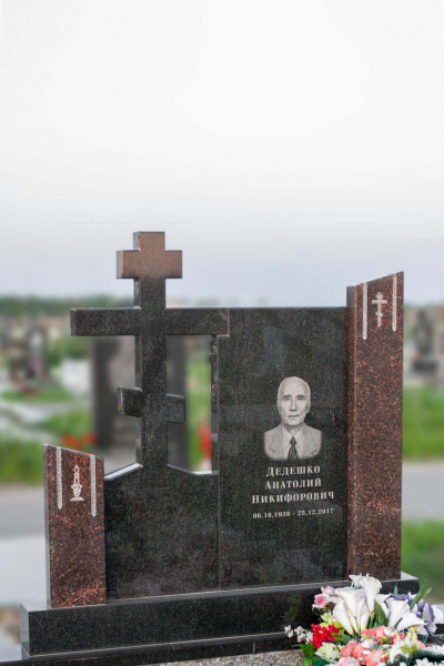 Ассиметричный памятник с крестом и колоннами. Ритуальное изделие имеет ассиметричную форму и состоит из нескольких частей, создающих единый монумент. Оригинальное сочетание составляющих памятника придает ему эксклюзивность и выделяет на фоне остальных изделий. Гранитный крест возвышается над прямоугольной стелой и двумя колоннами, приковывая к себе внимание. Колонны по обе стороны стелы имеют разную высоту и изображения креста и свечи. Размеры памятника и соотношение объемов его составляющих проработаны специалистами с учетом имеющейся нагрузки и визуального восприятия. Такой подход гарантирует долговечность и исключает искажения памятника.
