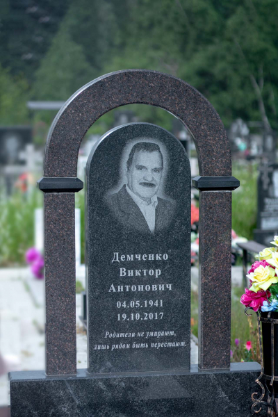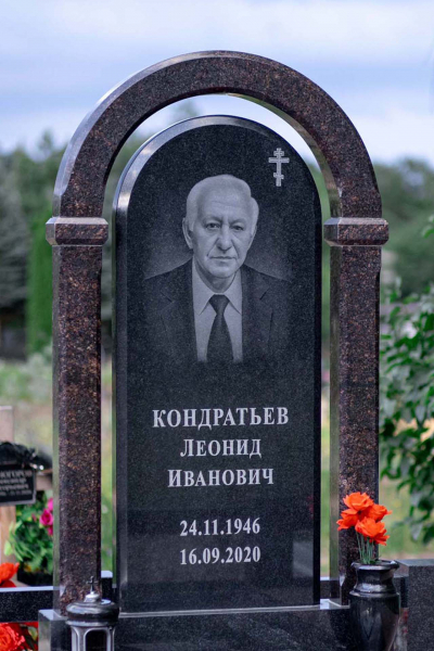 Памятник арка выполнен в классических темных оттенках, имеет закрытое надгробие и вазу у основания стелы. Монумент в виде арки придает ритуальному изделию эксклюзивность, такой памятник всегда обратит на себя внимание. Арочные своды, обрамляющие стелу, символизируют небесный свод. Такая форма памятника создаст атмосферу безмятежности и поможет достойно выразить дань уважения погребенному. Размер и форма памятника проработаны специалистами с учетом нагрузки и эстетического восприятия ритуального изделия. Такой подход исключает возможные искажения и деформации ритуального изделия.