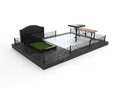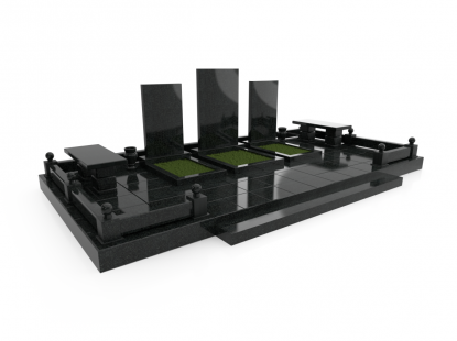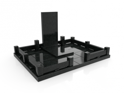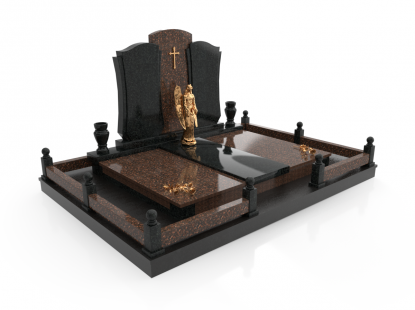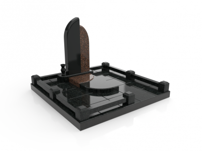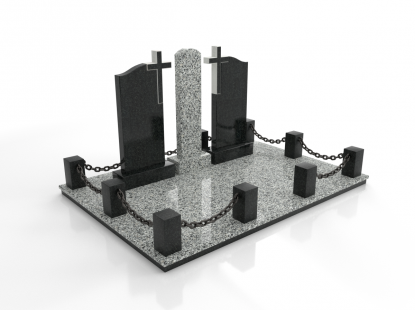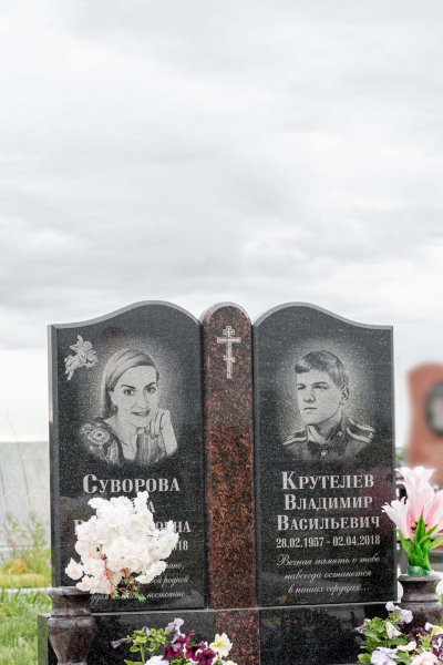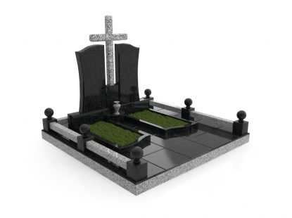 Семейный памятник в виде симметричной стелы и гранитного надгробия. Ритуальное изделие объединено контрастным элементом по линии стелы и надгробия. Стела памятника сочетает в себе две вертикальные части из черного гранита и узкую контрастную полосу по центру с изображением креста. Надгробие разделено на две части, персонализируя каждую из его сторон. У подножия расположены две гранитные вазы для цветов. Открытое надгробие позволяет использовать его поверхность для высадки цветов или других растений. При изготовлении памятника специалисты тщательно прорабатывают соотношение форм, размеров и нагрузку, чтобы исключить деформации и искажения изделия со временем.