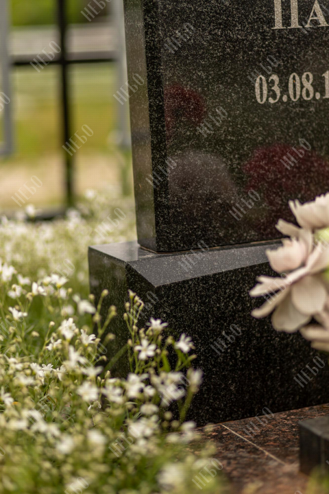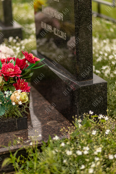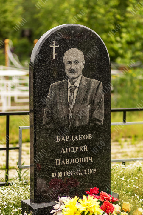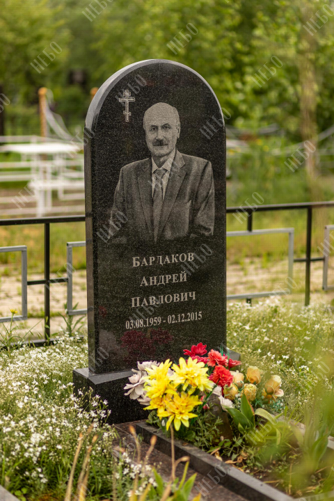 Христианский памятник выполнен в лаконичном черном цвете, сочетает в себе фигурную гранитную плиту и открытое надгробие. Формы и размеры памятника подобраны специалистами с учетом нагрузки и визуального восприятия ритуального изделия. Мягкие изгибы контура стелы придают памятнику индивидуальность, в то же время не выходя за рамки православных канонов.