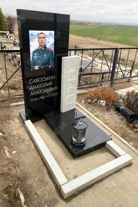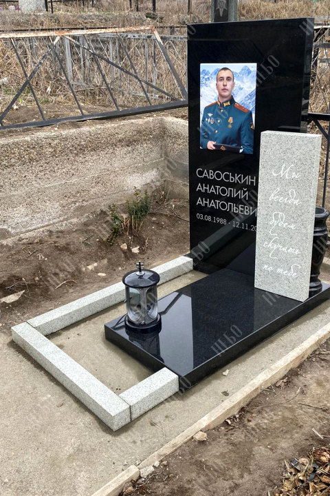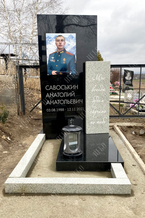Эксклюзивный памятник по индивидуальному дизайну с двухуровневой стелой, вазой и закрытым надгробием. Ритуальное изделие имеет широкую ассиметричную стелу, состоящую из двух частей. На стеле памятника располагается фото усопшего, а на дополнительный плите - эпитафия. Вся ритуальная композиция смотрится дорого и приковывает взгляды. Размеры стелы и надгробия соответствуют заданным нормам при имеющейся нагрузке и исключают деформации со временем.