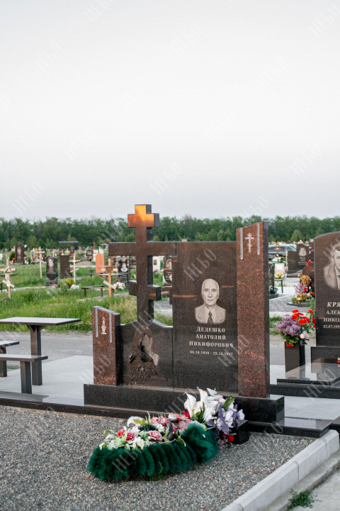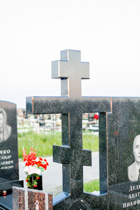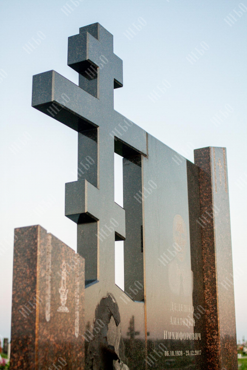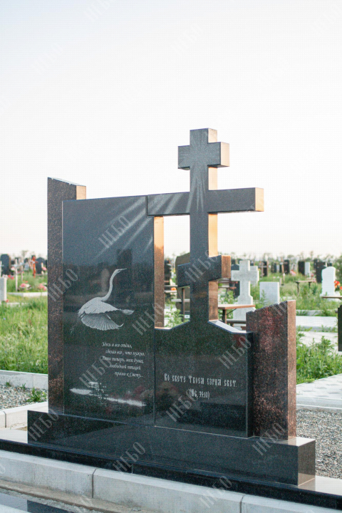 Ассиметричный памятник с крестом и колоннами. Ритуальное изделие имеет ассиметричную форму и состоит из нескольких частей, создающих единый монумент. Оригинальное сочетание составляющих памятника придает ему эксклюзивность и выделяет на фоне остальных изделий. Гранитный крест возвышается над прямоугольной стелой и двумя колоннами, приковывая к себе внимание. Колонны по обе стороны стелы имеют разную высоту и изображения креста и свечи. Размеры памятника и соотношение объемов его составляющих проработаны специалистами с учетом имеющейся нагрузки и визуального восприятия. Такой подход гарантирует долговечность и исключает искажения памятника.
