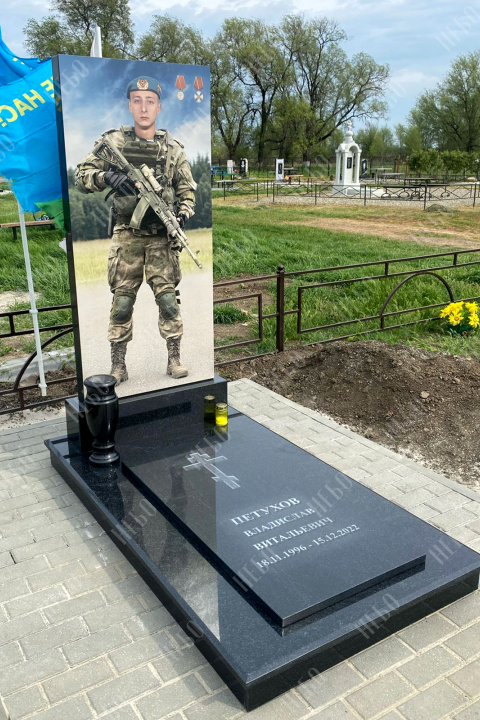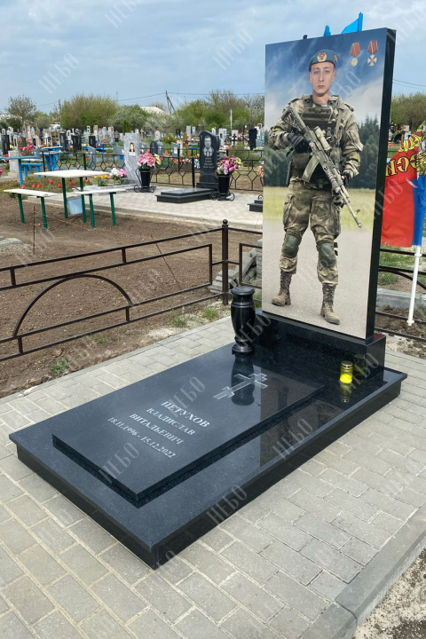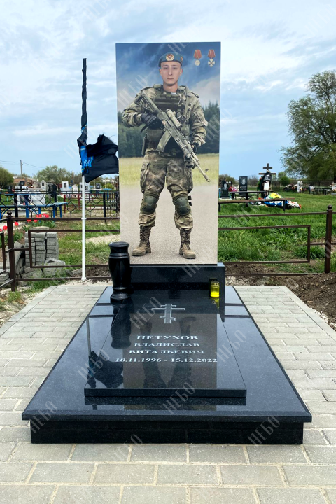Памятник ростовой из карельского гранита с крупноформатной печатью. Вертикальная гранитная плита выполнена в классической прямоугольной форме. Памятник изготовлен для героя СВО по индивидуальному заказу. Закрытое надгробие имеет правильную прямоугольную форму, ровную сплошную поверхность без дополнительных элементов, что значительно упрощает уход за ритуальным изделием. Размеры памятника и соотношение объемов стелы к надгробию проработаны специалистами с учетом имеющейся нагрузки и визуального восприятия. Такой подход гарантирует долговечность и исключает искажения памятника.